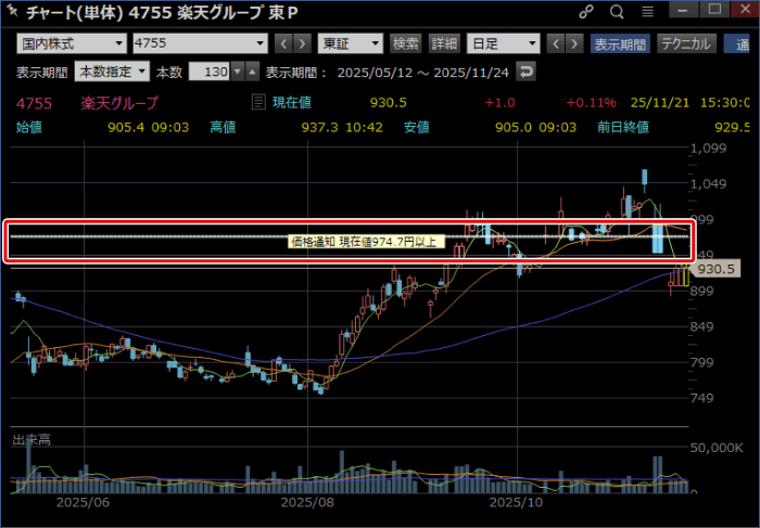 - 価格通知を設定したい価格にマウスカーソルを合わせます。