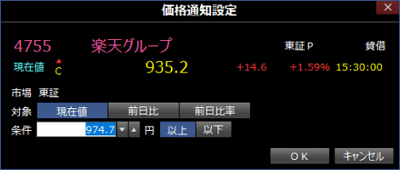 - 「価格通知設定」画面が起動します。チャートで指定した価格が自動で入力されていることを確認し、必要に応じてその他の設定を行います。